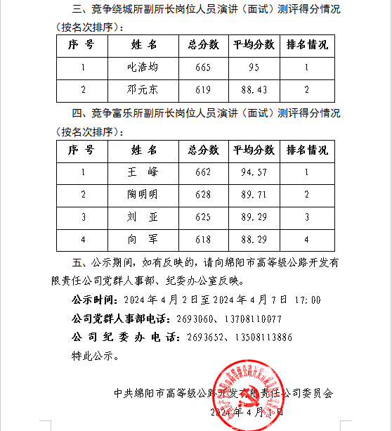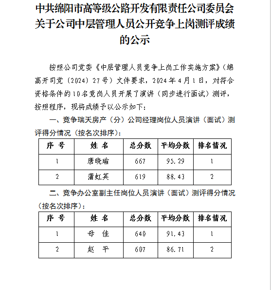 關(guān)于公司中層管理人員公開(kāi)競(jìng)爭(zhēng)上崗測(cè)評(píng)成績(jī)的公示